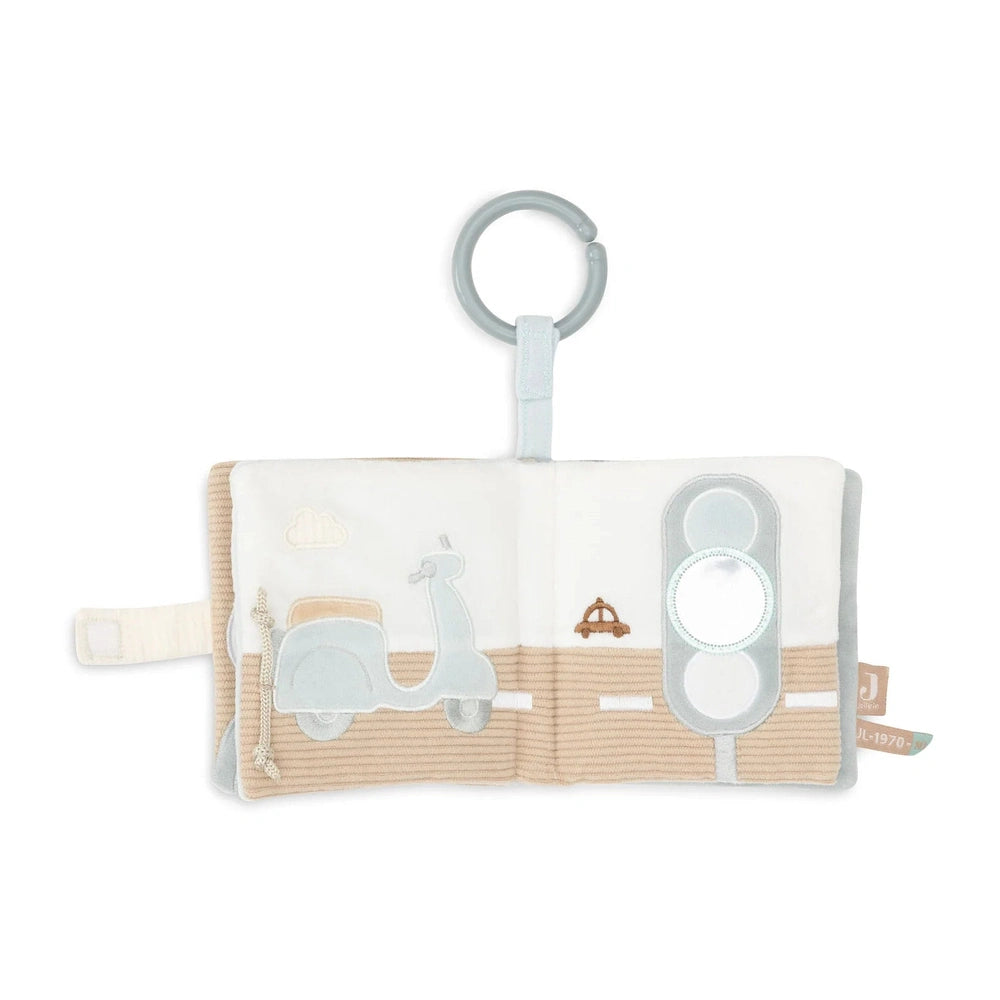 Ontdek de wereld met dit unieke activiteitenboekje in het "On The Go" thema! Met vier pagina’s van superzachte ribstof in Sea Green en Cloud Blue is dit boekje perfect voor nieuwsgierige handjes. Elke pagina zit vol verrassingen: knisperingen, speelse koordjes en schattige spiegeltjes in de vorm van verkeerslichten. Aan het boekje hangt een leuke sleutel met knispergeluid voor extra speelplezier. Dit activiteitenboekje prikkelt de zintuigen van je kleintje en zorgt voor eindeloos vermaak, ook onderweg!