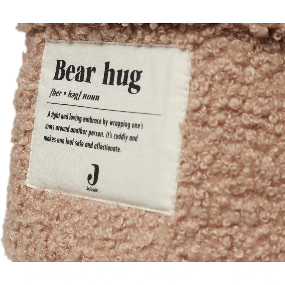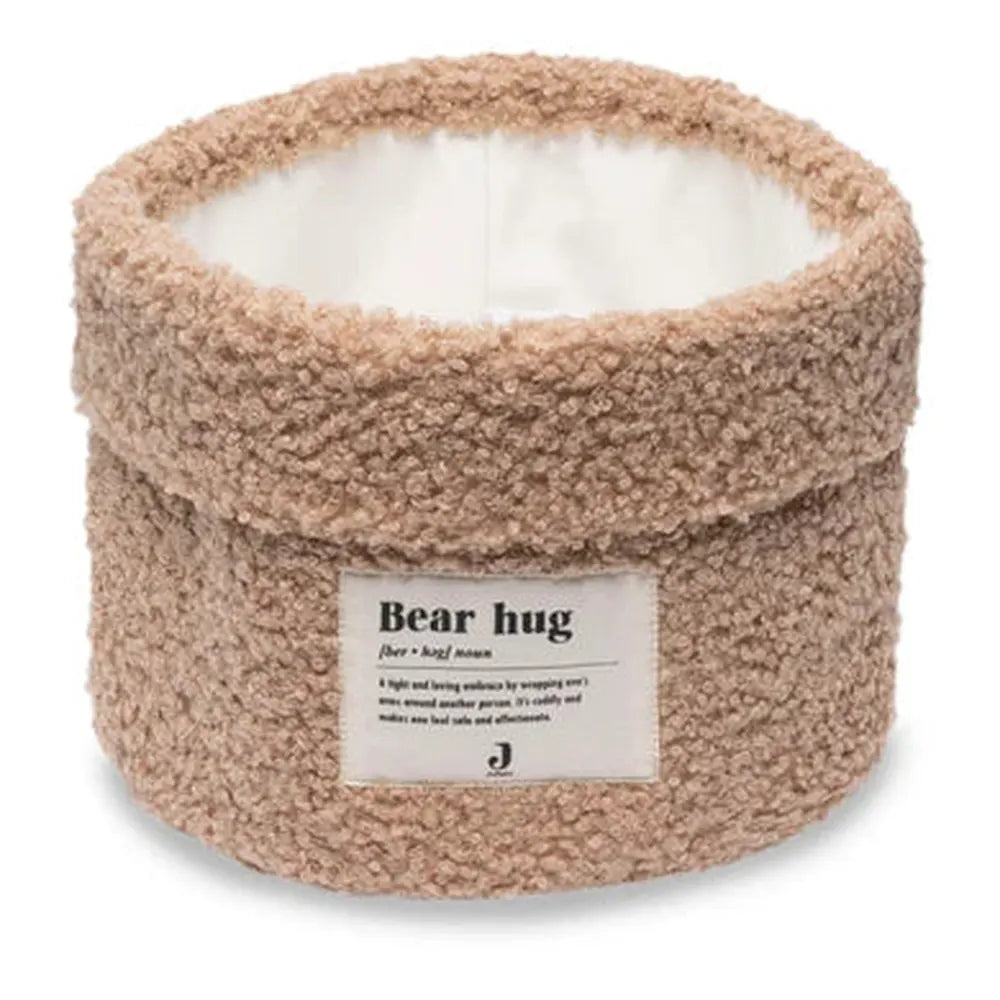 Met een hoogte van 14 cm en een diameter van 18 cm is dit opbergmandje perfect voor kleine verzorgingsspulletjes zoals een borsteltje, manicuresetje, thermometer of sokjes. Dankzij het handige formaat en de stevige vorm houd je alle benodigdheden overzichtelijk en binnen handbereik. Op de voorkant prijkt een schattig ‘Bear Hug’ logo, dat prachtig aansluit bij de andere items uit de Bouclé collectie van Jollein.