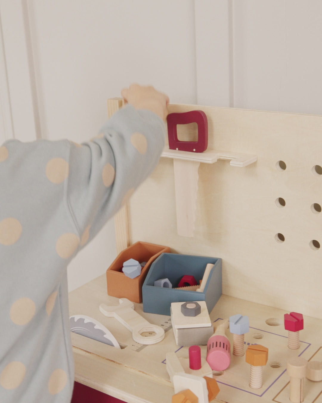Bevat: *Gereedschapsbank *Speelgoedhamer *Schroevendraaier *Speelgoedzaag *Sleutel *Schuurpapierhouder *Twee schuurpapieren *Drie spijkers *Negen schroeven *Negen moeren *Schroefdozen *Acht bouwplaten