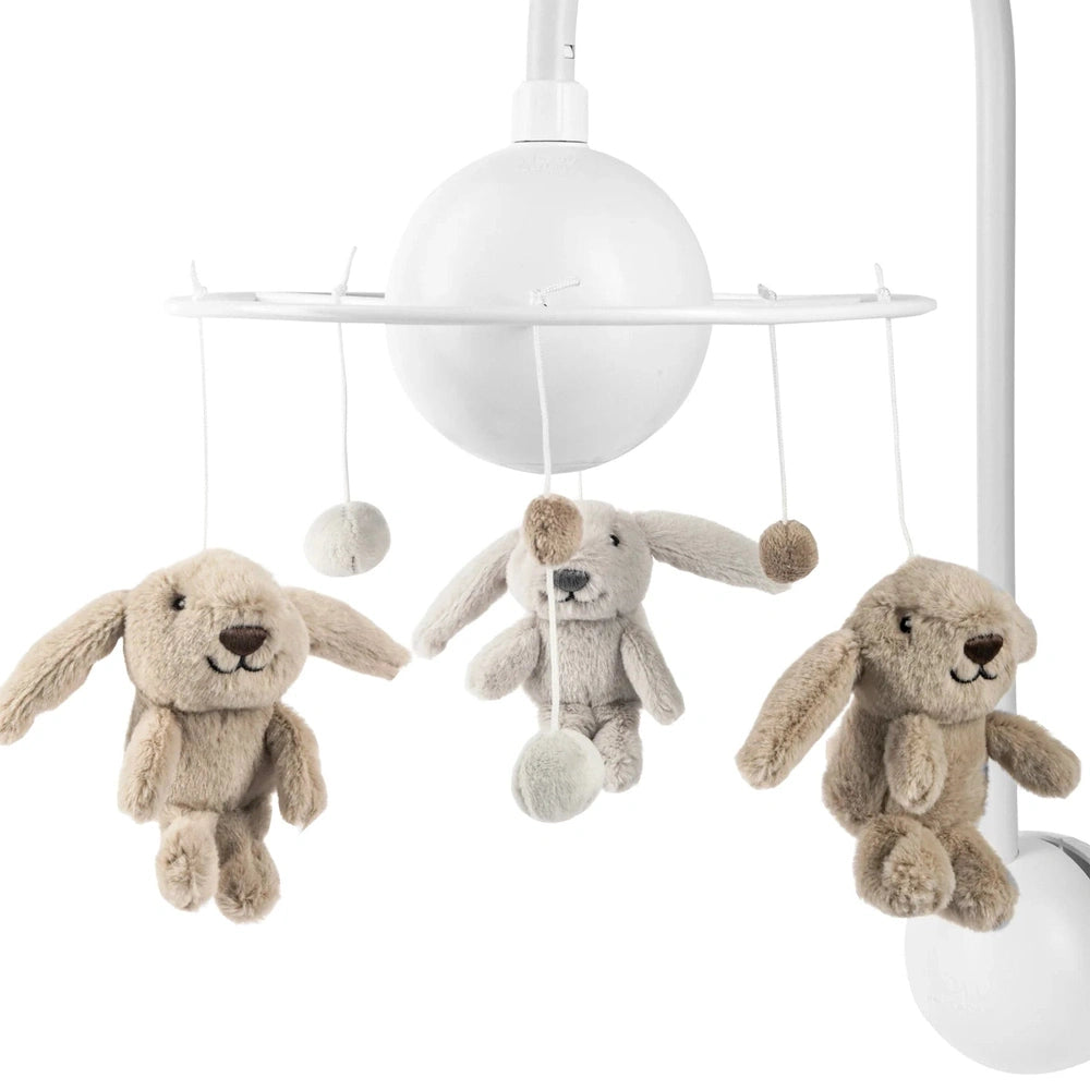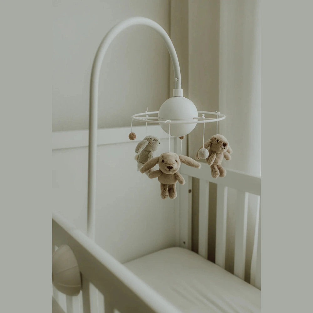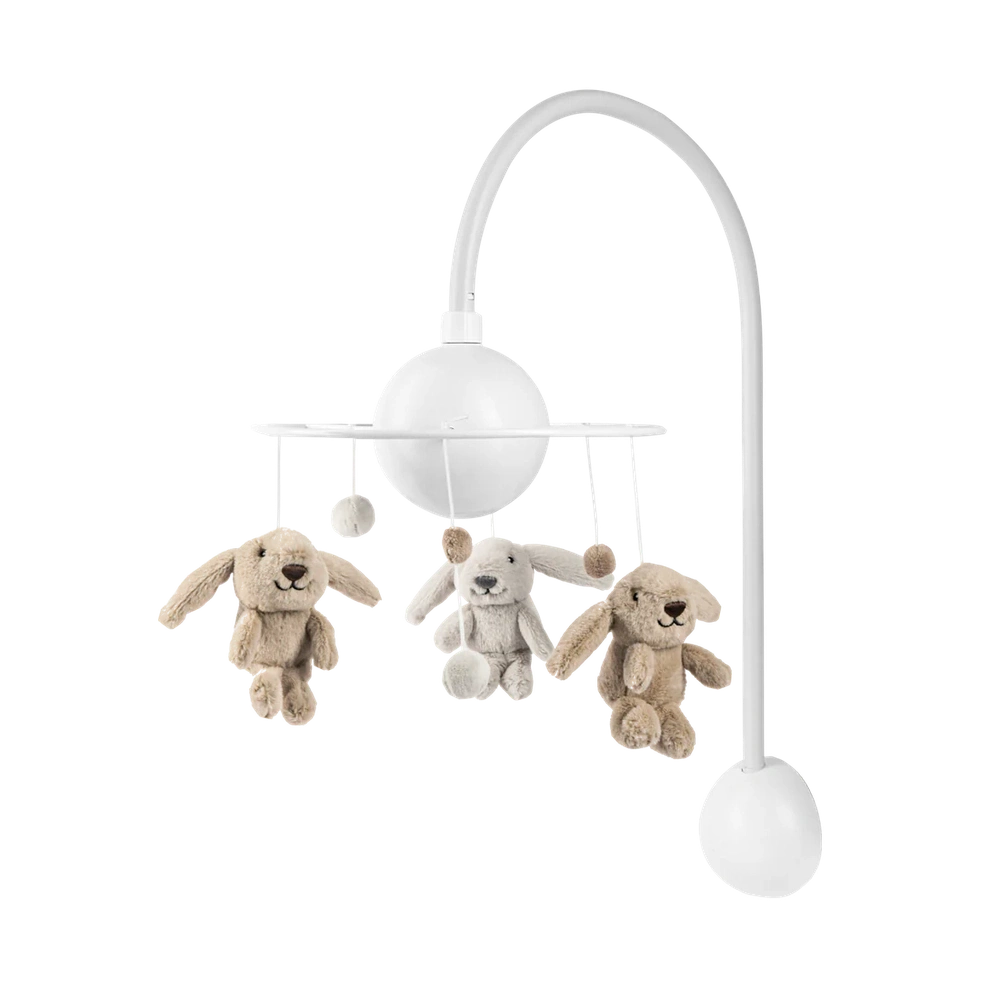 Onze Milo boxmobiel is een hippe mobiel die je baby kan kalmeren door de lieve melodietjes en zijn leuke konijnen vriendjes. Je kan kiezen uit vier verschillende melodieën, Mozart en Meditatie zijn onze favorieten! De mobiel heeft een optionele timer functie waarbij je kunt kiezen uit 15 en 30 minuten. Hij is oplaadbaar en komt met een afstandsbediening. Naast dat de mobiel er leuk uit ziet en leuke melodietjes heeft, is deze ook goed voor de visuele ontwikkeling van je baby! Kijk naar de product video om een nog beter beeld te krijgen van de mobiel en alle melodietjes te beluisteren!