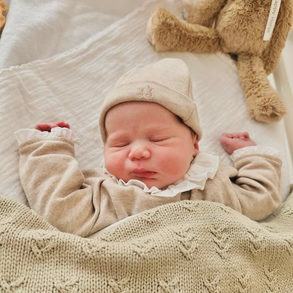 Ce bonnet pour bébé Poetree Kids est en camel clair et fabriqué à partir d'un matériau doux et extensible. Ce bonnet tricoté a un joli broderie sur le revers.