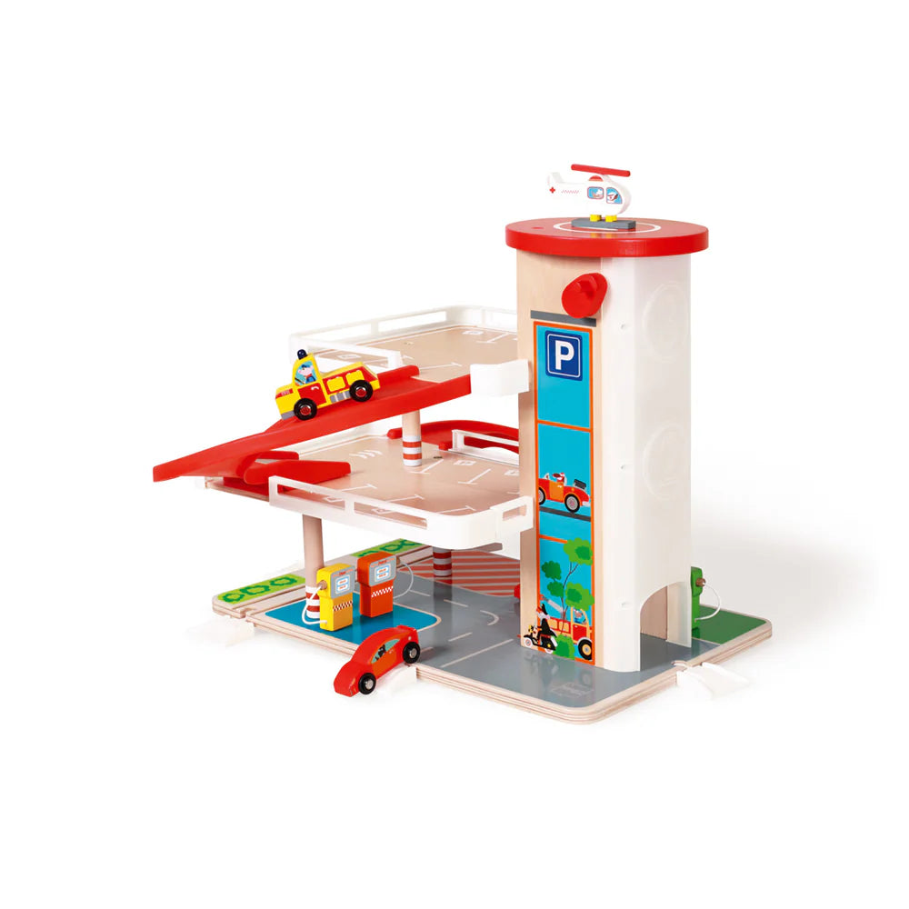 Inclus, il y a 2 voitures en bois, un hélicoptère en bois et 3 pompes à essence en bois amovibles. Design unique de Scratch avec des dessins amusants et colorés.